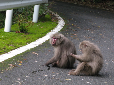 道には猿がのんびり蚤取り。